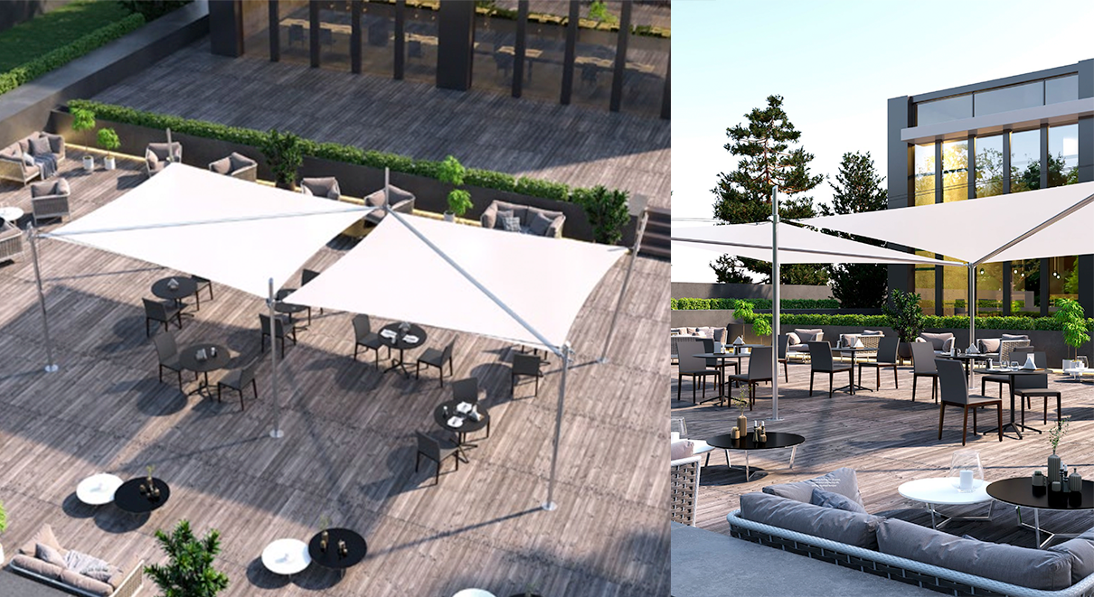 戶外獨立式飛翼簾 單幅最大尺寸: 7000x7000mm Kheope 13 單幅最大尺寸: 9200x9200mm 需四個支撐點